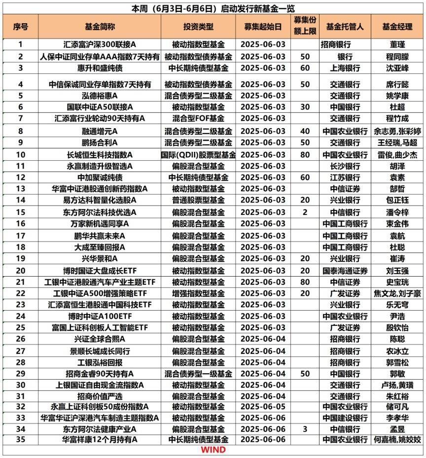本周(6月3日—6月6日)有35只新基金“同台竞技”,其中,6月3日就有25只新基金密集发行。从数量来看,指数型基金产品占“大头”。